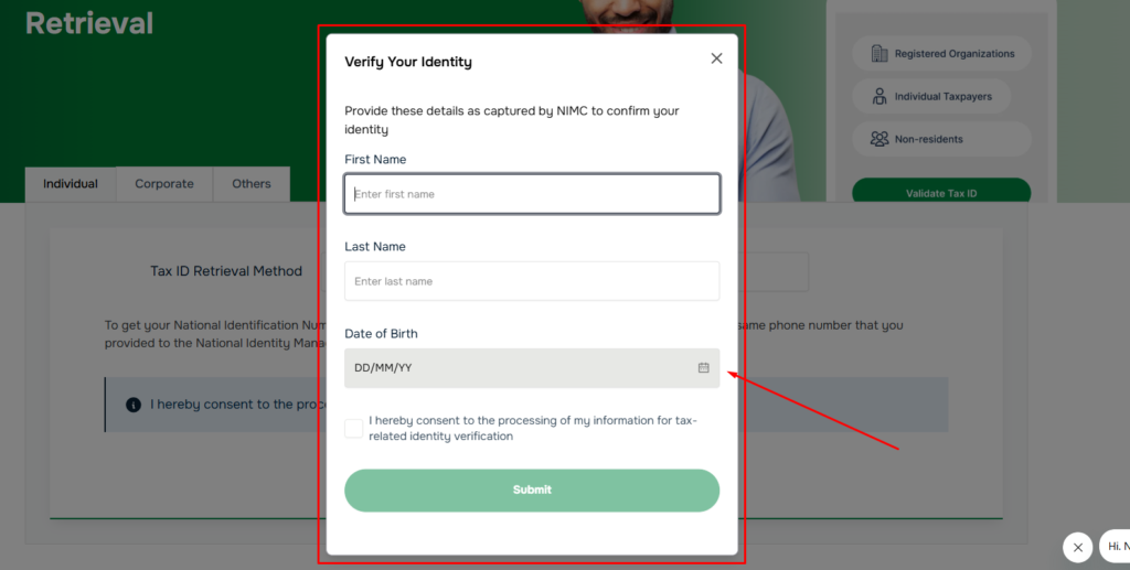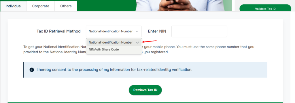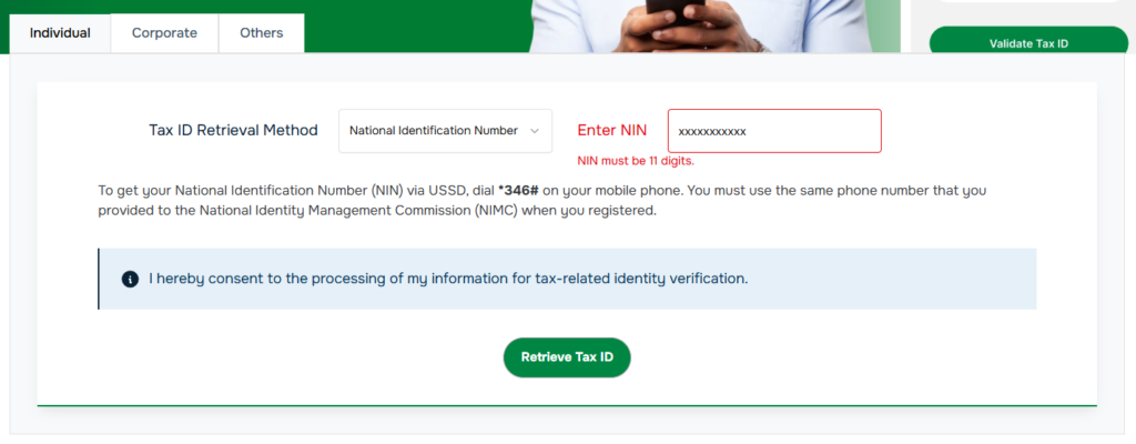 After entering your NIN, scroll down and click the green button that says “Retrieve Tax ID”